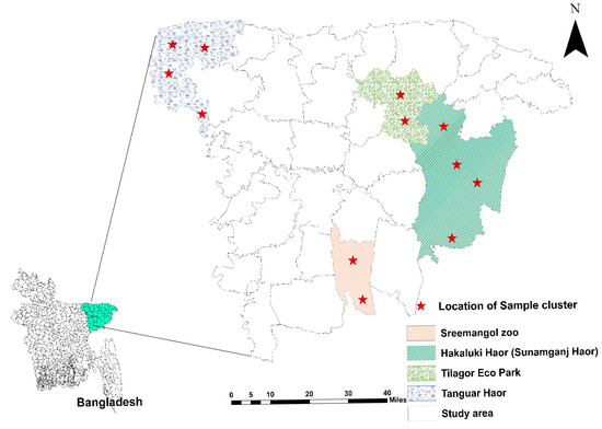 From January 2022 to July 2022, a cross-sectional investigation was conducted in Haripur, the Hakaluki Haor of Moulvibazar, the Tanguar Haor, and parts of the Tahirpur upazila of Sunamganj District, based on the accessibility and density of birds (Figure 1). Feces from captive wild birds were obtained from Tilagor Eco-Park, Sylhet, and the Bangladesh Bannyaprani Sheba Foundation, Sreemangal, Bangladesh. Migratory bird species were prioritized due to their potential role in the long-distance dissemination of pathogenic bacteria. Captive wild birds were also included to provide a baseline for AMR prevalence in local avian populations. Species were selected based on prior studies indicating their exposure to anthropogenic influences in agricultural areas, wetlands, or rural feeders.