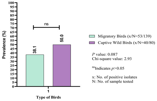 Comparative assessment of prevalence (%) of Klebsiella pneumoniae between migratory and captive wild birds.