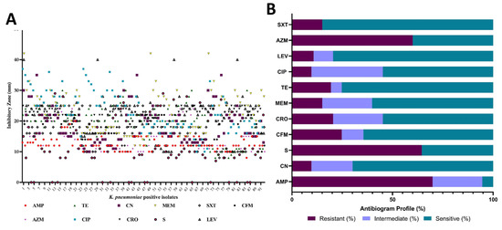 Zone of inhibition (mm) of 11 antimicrobials against positive isolates of K. pneumoniae (A). AMP: ampicillin, TE: tetracycline, CN: gentamicin, MEM: meropenem, SXT: trimethoprim-sulfamethoxazole, CFM: cefixime, AZM: azithromycin, CIP: ciprofloxacin, CRO: ceftriaxone, S: streptomycin, LEV: levofloxacin. The antibiogram profile showing the percent (%) of sensitive, intermediate, and resistance of the tested antimicrobials (B).