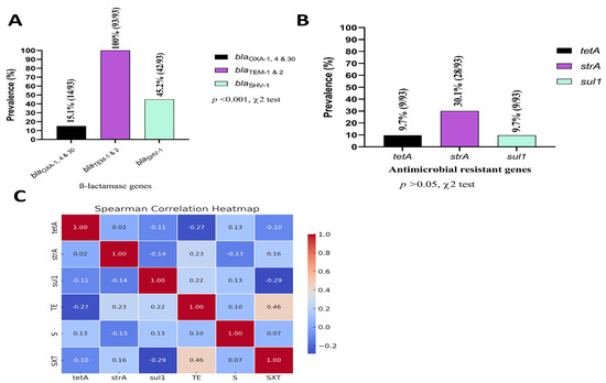 Frequency (%) of ß-lactamase encoding genes (A); Frequency (%) of selected antimicrobial resistant genes (B); Spearman correlation coefficient (phenotype–genotype correlation) among the most common antibiotics used against K. pneumoniae in this region with their respective genes (C). TE: tetracycline, SXT: trimethoprim-sulfamethoxazole, S: streptomycin.