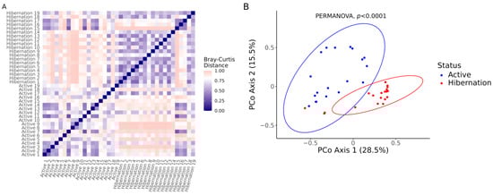 Beta diversity of gut bacterial communities in active and hibernating Nyctalus noctula (n = 19). (A) Heatmap of Bray–Curtis dissimilarity indices between samples, visualized as a symmetric matrix. Samples are ordered by physiological status (Active or Hibernation), with darker colors indicating greater similarity (lower distance). (B) Principal Coordinate Analysis (PCoA) plot based on Bray–Curtis distances. Each point represents a sample, colored by status (blue for Active, red for Hibernation). Ellipses represent 95% confidence intervals for each group. PERMANOVA = permutational multivariate analysis of variance.