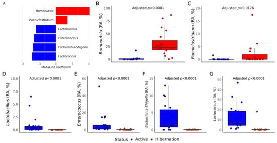 Differentially abundant genera between active and hibernating Nyctalus noctula (n = 19) were identified using MaAsLin2. (A) Barplot of taxa significantly associated with hibernation status based on MaAsLin2 coefficients (p < 0.05). Positive values (red) represent enrichment in hibernating bats; negative values (blue) represent enrichment in active bats. (B–G) Boxplots showing relative abundance (RA, %) distributions of key taxa significantly differing between groups: Romboutsia, Paeniclostridium, Lactobacillus, Enterococcus, Escherichia–Shigella, and Lactococcus.