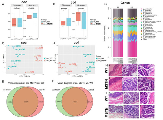 Distribution, diversity of microorganisms, and histological features in the cecum and colon of MSTN gene-edited cattle and WT cattle. (A) Analysis of the α diversity indices of cecal (cec) microorganisms. (B) Analysis of the α diversity indices of colonic (col) microorganisms. (C) PCA of cecal microorganisms. (D) PCA of colonic microorganisms. (E) Volcano plot analysis of cecal microorganism unigenes. (F) Volcano plot analysis of colonic microorganism unigenes. (G) Analysis of the relative abundance of cecal and colonic microbial genera. (H) Analysis of caecal wall and villus morphology. (a–c): WT cattle, (d–f): MSTN gene-edited cattle. (I) Analysis of the morphology of the colonic wall and villus morphology. (a–c): WT cattle, (d–f): MSTN gene-edited cattle (μm).