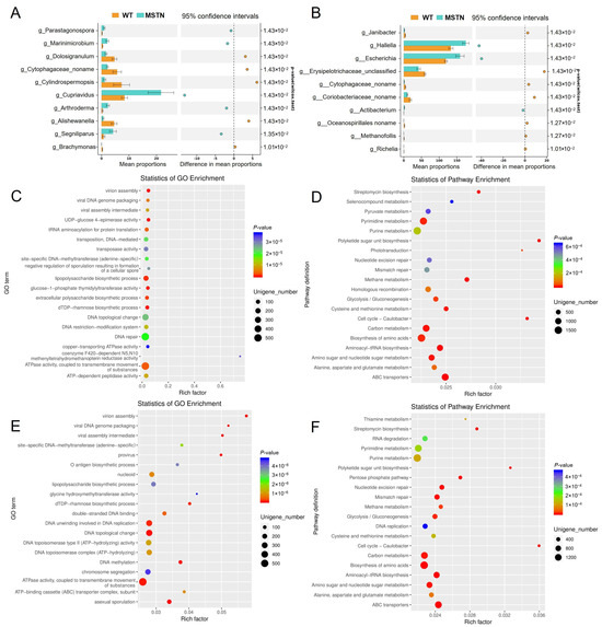 GO and KEGG functional analyses of the differentially abundant microorganisms. (A) Stamp analysis of the top ten differential microorganisms in the cecum. (B) Stamp analysis of the top ten differential microorganisms in the colon. (C) GO analyses of differentially abundant microorganisms in the cecum. (D) KEGG analyses of differentially abundant microorganisms in the cecum. (E) GO analyses of differentially abundant microorganisms in the colon. (F) KEGG analyses of differentially abundant microorganisms in the colon.