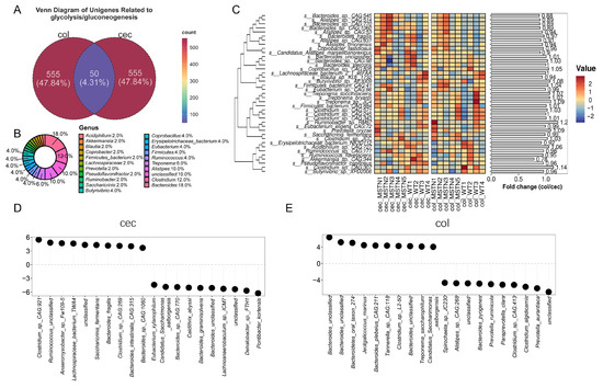 Analysis of microorganisms related to glycolysis/gluconeogenesis in the cecum and colon. (A) Venn diagram of unigenes related to glycolysis/gluconeogenesis. (B) Microbial genera corresponding to the 50 common differential unigenes. (C) Abundance and distribution of species involved in glycolysis/gluconeogenesis in the cecum and colon. (D) Top 10 microbial taxa with increased and decreased involvement in the glycolysis/gluconeogenesis pathway in the cecum of MSTN gene-edited cattle. (D,E) Top 10 microbial taxa with increased and decreased involvement in the glycolysis/gluconeogenesis pathway in the colon of MSTN gene-edited cattle.