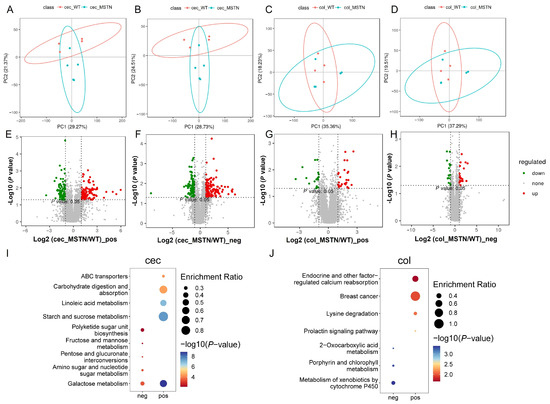 Functional analysis of differentially abundant metabolites. (A) PCA of metabolites in the cecum in the pos modes. (B) PCA of metabolites in the cecum in the neg modes. (C) PCA of metabolites in the colon in the pos modes. (D) PCA of metabolites in the colon in the neg modes. (E) Volcano plot of differentially abundant metabolites in the pos modes in the cecum. (F) Volcano plot of differentially abundant metabolites in the neg modes in the cecum. (G) Volcano plot of differentially abundant metabolites in the colon in the pos groups. (H) Volcano plot of differentially abundant metabolites in the colon in the neg groups. (I) Pathway analysis of differentially abundant metabolites in the cecum. (J) Pathway analysis of differentially abundant metabolites in the colon.