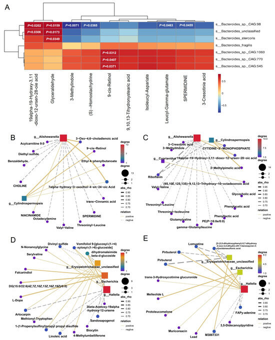 Correlation network of metabolites and microbial correlations. (A) Associations between Bacteroides species related to glycolysis/gluconeogenesis and corresponding metabolites identified in both the cecum and colon. (B) Correlation network analysis of differential microorganisms and metabolites in the pos mode in the cecum. (C) Correlation network analysis of differential microorganisms and metabolites in the neg mode in the cecum. (D) Correlation network analysis of differentially abundant microorganisms and metabolites in the colon in pos mode. (E) Correlation network analysis of differentially abundant microorganisms and metabolites in the neg mode in the colon.