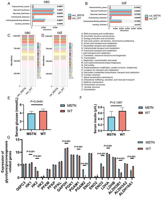 Carbohydrase and related counterpart metabolic analyses. (A) Cecum carbohydrase analysis. (B) Colonic carbohydrase analysis. (C) Cecum carbohydrase analysis. (D) Colonic carbohydrase analysis. (E) Comparison of serum glucose levels (mmol/L). (F) Comparison of serum insulin levels (μL/mL). (G) Expression of genes (FPKM) related to glycolysis/gluconeogenesis pathway in muscle tissue. Data are presented as mean ± standard deviation (SD). * indicates a statistically significant difference (p < 0.05).