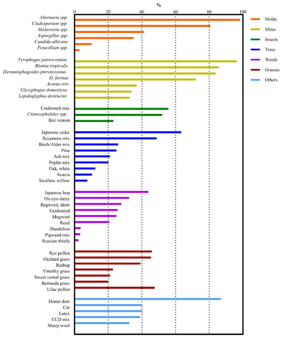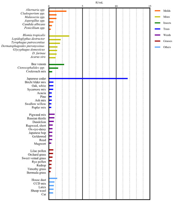 The EuroBlotOne system (Euroimmun, Lübeck, Germany) and the RoboScreen™ system (Mediwiss Analytic GmbH, Moers, Germany) were used for the MAST–immunoblot assay according to the manufacturers’ instructions, and all other experimental conditions were consistently maintained throughout the analyses. Briefly, 300 μL of each patient’s serum was pipetted into a reaction chamber containing allergens immobilized on a nitrocellulose membrane and then incubated at room temperature for 45 min. After washing, the serum was added to an anti-canine IgE antibody conjugated with biotin, followed by incubation at room temperature for 30 min. This biotin-conjugated antibody acts as a secondary antibody, catalyzing the transformation of a specific substrate with distinguishable properties. After washing to remove the unbound antibodies, the serum was added to 300 μL of streptavidin conjugated to alkaline phosphatase and then incubated at room temperature for 20 min. The unbound conjugate was removed by washing. Next, we added the color-development solution, incubated the sample at room temperature for 20 min, and then dried the strips. The results were converted into IU/mL using a formula, specific to each antigen, which was built into the program based on the band’s color intensity [1]. All subjects underwent a MAST for 130 allergens classified into eight groups (molds, mites, insects, trees, grasses, weeds, others, and foods) as determined by the laboratory. Table S1 in the Supplementary Materials lists the specific allergens in each group.