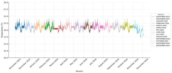 Temperature values recorded throughout the study period: the x-axis represents time in months, with each month indicated by a specific color, as shown in the legend, and the y-axis indicates temperature values in degrees Celsius.
