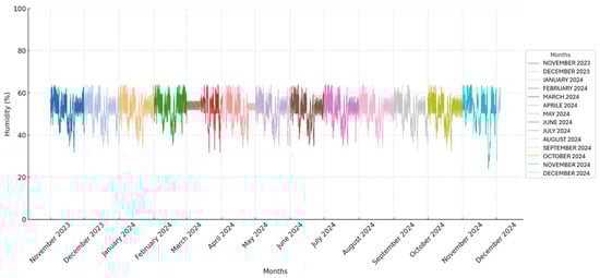 Humidity values recorded throughout the study period: the x-axis represents time in months, with each month indicated by a specific color, as shown in the legend, and the y-axis indicates humidity values in percentage.