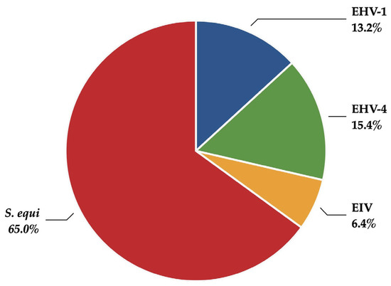 Samples were tested by real-time polymerase chain reaction (PCR). RNA and DNA were extracted from the different samples used in this study with the MagMax RNA/DNA isolation kit on a KingFisherTM Flex Purification System (Thermo Fisher Scientific, Waltham, MA, USA). Real-time PCR, as previously described, with some modifications, was used for the detection of EIV, EHV-1, EHV-4, and S. equi [13,14,15]. In brief, the extracted RNA/DNA was tested using the AgPath-IDTM One-Step RT-PCR Kit (Thermo Fisher Scientific, Waltham, MA, USA) on a QuantStudioTM 5 system (Thermo Fisher Scientific, Waltham, MA, USA) with the following program: 10 min at 45 °C, 10 min at 95 °C, followed by 45 cycles of 15 s at 95 °C, and 45 s at 60 °C.