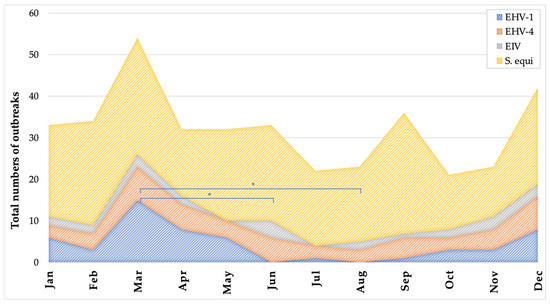 Monthly distribution of confirmed outbreaks caused by equid alphaherpesvirus 1 (EHV-1), equid alphaherpesvirus 4 (EHV-4), equine influenza virus (EIV), and Streptococcus equi subsp. equi reported through the SEIN surveillance system between June 2019 and April 2023. The total number of outbreaks is plotted per calendar month, aggregated over nearly four years, with one value for May missing. Asterisks indicate a statistically significant difference (p < 0.05), as determined by the Kruskal–Wallis test.
