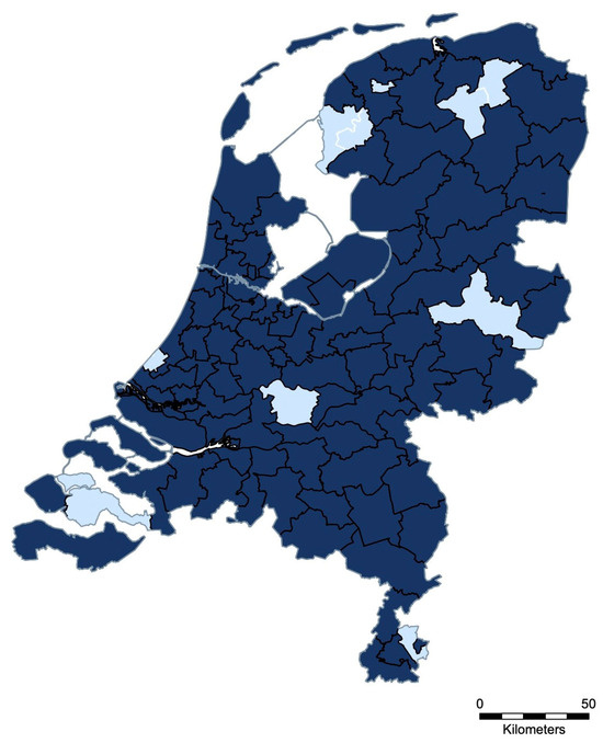 Geographical distribution of SEIN outbreaks in the Netherlands (June 2019–April 2023). Dark blue indicates two-digit postal code areas where at least one alert was generated. Light blue indicates areas with no reported outbreak.