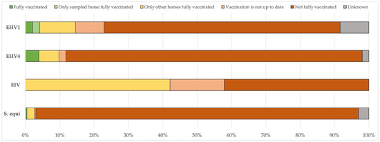Vaccination status of the horses on premises with confirmed and reported outbreaks, excluding mixed infections. EHV-1: equid alphaherpesvirus 1; EHV-4: equid alphaherpesvirus 4; EIV: equine influenza virus; S. equi: Streptococcus equi subsp. equi.