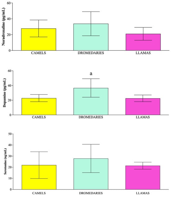 Mean values ± standard deviation (±SD) of serum concentration of noradrenaline, dopamine and serotonin measured in camels, dromedaries, and llamas, together with the relative statistical significance. Statistical significance (p < 0.05): a vs. llamas.