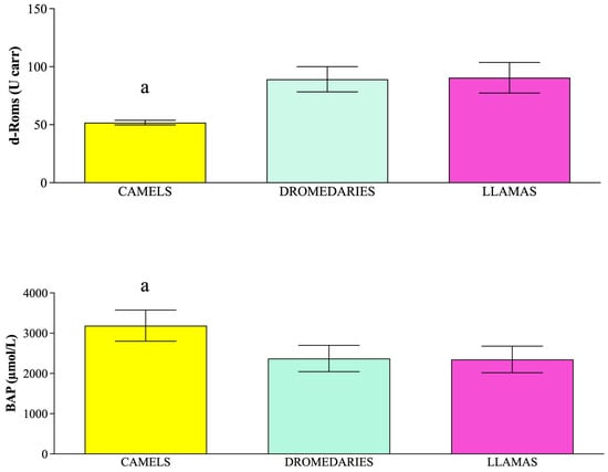 Mean values ± standard deviation (±SD) of plasma reactive oxygen metabolites (d-Roms) and biological antioxidant potential (BAP) values measured in camels, dromedaries and llamas together with the relative statistical significances. Statistical significance (p < 0.05): a vs. dromedaries and llamas.