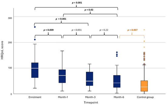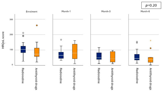 There was no difference in HRQoL score between the treatment groups upon enrolment (p = 0.22, see Table 2 for the scores). Although the changes in median HRQoL scores within the groups (Table 2, Figure 1) suggest a possible faster improvement in median HRQoL scores within the RAIT-group (within 1 month) when compared to the ATD-group (improvement within 3 months); mixed effects modelling revealed that there was no effect of the treatment group on the log(HRQoL) scores (p = 0.20). However, timepoint had a significant effect on the log(HRQoL) score (p < 0.001), with log(HRQoL) being higher (indicating poorer QoL) at enrolment when compared to all other timepoints (all p < 0.05, see Figure 2 for the exact p-values). Log(HRQoL) score was also significantly higher at month-1 when compared to month-6, but there was no difference between month-1 and month-3 and between month-3 and month-6 (Figure 2).