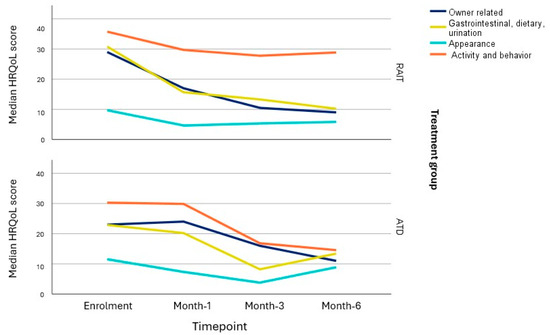 Changes in the HRQoL score per each of the four domains (“owner related”, “gastrointestinal, dietary, urination”, “appearance”, and “activity and behaviour”) are visualised in Figure 3. In the RAIT-group, significant improvement (i.e., lower HRQoL scores) from enrolment to month-6 was reached in the domains “owner related” (p = 0.02) and “gastrointestinal, dietary, urination” (p = 0.002) but not in the domains “appearance” (p = 0.09) and “activity and behaviour” (p = 0.5). In the ATD-group, only the domain “owner related” reached significant improvement (p = 0.02) at month-6 (“gastrointestinal, dietary, urination” p = 0.31, “appearance” p = 1.0, and “activity and behaviour” p = 0.14).