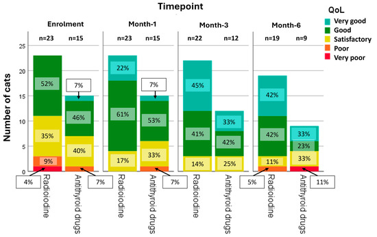Bar chart depicting the owners’ rating of their cat’s overall quality-of-life (QoL) on a 5-point scale from very poor to very good at all four timepoints (enrolment, month-1, month-3, month-6) for both treatment groups (radioiodine and antithyroid drug group). Number (n) of cats with available QoL assessment and the percentage of cats with the respective rating (from very poor to very good) is provided at each timepoint within each group.