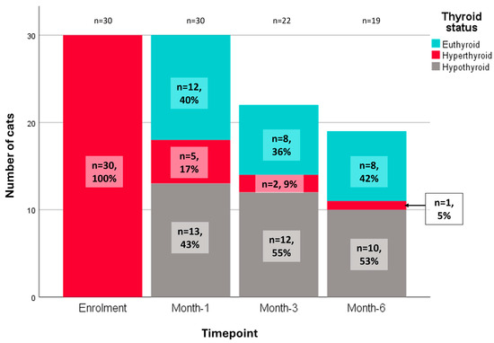 Thyroid status could be assessed in 30 cats (RAIT-group: 23; ATD-group: 7) at enrolment, in 30 cats (RAIT-group: 23; ATD-group: 7) at month-1, in 22 cats (RAIT-group: 22; ATD-group: 0) at month-3, and in 19 cats (RAIT-group: 17; ATD-group: 2) at month-6. Thyroid status at enrolment and the follow-up timepoints is presented in Figure 5.