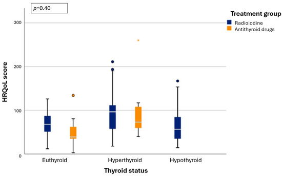 Box whisker plots depicting the health-related quality-of-life (HRQoL) score of cats in the radioiodine treatment group (blue) and the antithyroid drug group (orange) across thyroid status categories (hyper-/eu-/hypothyroid) including all HRQoL results of all cats with known thyroid status over all four timepoints presented by treatment group. The bold white line within the box shows the median value, boxes represent the interquartile range (IQR). The whiskers denote the range extending out to 1.5 × IQR, and data points that were >1.5 × IQR are shown as circles with the asterisk (*) representing an extreme value (more than three times the height of the boxes). Mixed effects modelling revealed no significant effect of thyroid status on changes in HRQoL.