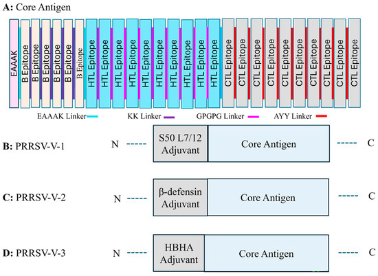 To construct the candidate vaccines, the core antigen was first organized via the assembly of selected epitopes for B cells, HTLs, and CTLs, with the help of linker sequences. KK, GPGPG, and AAY linkers were employed to group three classes of epitopes (Figure 2A). After that, three distinct adjuvant proteins, L7/12 S50 ribosomal protein, β-defensin, and HBHA, were added to enhance the boosting of the host immune system. The adjuvant proteins were attached with the core antigen at the N-terminus with EAAAK, a rigid linker. Correspondingly, three candidate vaccines were generated and termed PRRSV-V-1, PRRSV-V-2, and PRRSV-V-3, as shown in Figure 2B–D, while protein sequences of vaccine candidates were contained in Figure S4: