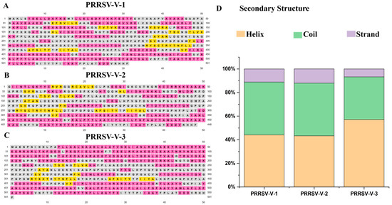 Secondary structure of vaccine candidate. (A–C) Illustration of the secondary structure for the PRRSV-V-1~PRRSV-V-3 vaccine candidate. Strand, helix, and coil are indicated with distinct colors: yellow, pink, and gray, respectively. (D) Histogram plot of secondary structure for PRRSV-V-1~PRRSV-V-3, showing the percentage distribution of coils, helices, and β-strands in each protein.