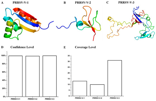 For the modeling of tertiary structure, templates c8yeqA, c1kj6A, and c2ch7B were employed on the Phyre2 platform corresponding to PRRSV-V-1, 2, and 3 candidates (Figure 4A–C). The levels of confidence and coverage are shown in Figure 4D,E.