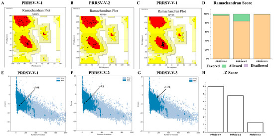Validation of vaccine candidates’ molecular structure. (A–C) The Ramachandran plot of PRRSV-V-1~PRRSV-V-3 emphasizes the residues in favorable A, B, and L regions displayed with red colors. (D) Histogram plot of Ramachandran, the distribution of residues in favored, allowed, and disallowed regions of PRRSV-V-1~PRRSV-V-3. (E–G) The Z-score plot of PRRSV-V-1 was scored as −5.98, PRRSV-V-1 score −4.8, and PRRSV-V-3 score as −1.24. (H) Histogram plot of Z-score of PRRSV-V-1~3, according to their Z-score plots.
