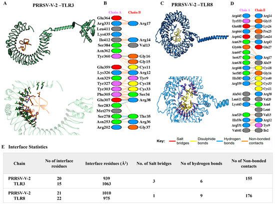 A molecular docking analysis of PRRSV-V-2-TLR3/8 complexes. PRRSV-V-2 docking with (A) TLR3 and (C) TLR8. The salt bridges (red), hydrogen bonds (blue), disulfide bonds (yellow), and non-bonded contacts (brown dots) formed in the interface between PRRSV-V-2 with (B) LR3 and (D) TLR8. (E) An analysis of the interface statistics properties of PRRSV-V-2 with TLR3 and TLR8.