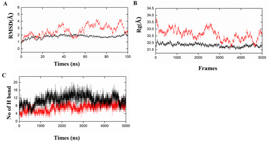 Molecular dynamic simulations of PRRSV-V-2 with TLR3/TLR8. (A) Root mean square deviation (RMSD): shows the RMSD for the complexes of PRRSV-V-2 with TLR3 and TLR8. (B) Radius of Gyration (Rg): Rg is the compactness of PRRSV-V-2 with TLR3 and TLR8. (C) Hydrogen Bonds: the count of intra-molecular hydrogen bonds formed by PRRSV-V-2 with TLR3 and TLR8. Graphical representations of the dynamic simulation of PRRSV-V-2 with TLR3 are indicated in red, whereas the dynamics simulation of PRRSV-V-2 with TLR8 is shown in black.