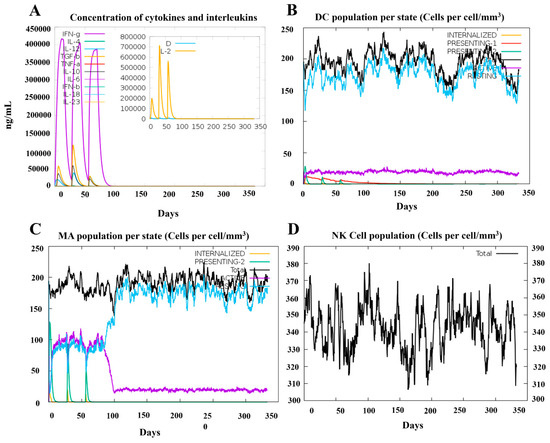 Simulation of innate immune response spots PRRSV-V-2 vaccination. (A) Kinetics of important cytokine expression levels after three PRRSV-V-2 dosages. (B) Dendritic cell (DC) responses following three PRRSV-V-2 doses. (C) Macrophages (MA) reactions to three doses of PRRSV-V-2 vaccination. (D) Natural killer (NK) cell dynamics after vaccination.