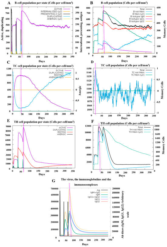 The adaptive immune response was also analyzed in this simulation to assess the activation of B cells, T cells, and immunoglobulins, with a particular focus on the B- and T-cell-related immune memory.