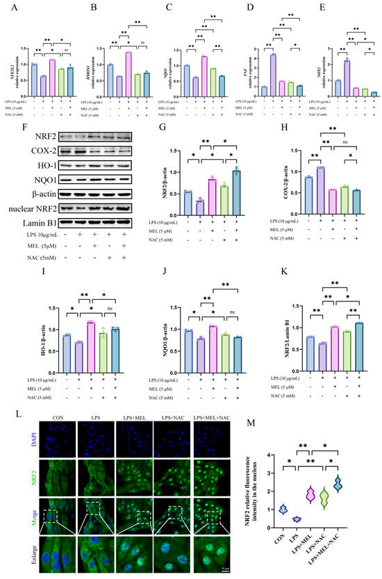 Meloxicam triggered Nrf2 signaling in the bovine endometrial epithelial cells challenged with lipopolysaccharide. The cells were subjected to the combined treatment with lipopolysaccharide (LPS), meloxicam (MEL), and/or N-acetyl-L-cysteine (NAC) for 12 h. Quantitative PCR was employed to assess alterations in the relative mRNA levels of NFE2L2 (A), HMOX1 (B), NQO1 (C), TNF (D), and NOX2 (E). Western blot (F) was utilized to determine the relative protein levels of total NRF2 (G), COX-2 (H), HO-1 (I), NQO1 (J), and nuclear NRF2 (K), where β-actin was used as an internal control. Immunofluorescence, with a scale bar of 10 μM, was used to visualize (L) and quantify (M) the amount of NRF2 protein in the nucleus. NRF2/NFE2L2, nuclear factor--erythroid 2 related factor 2. HO-1/HMOX1, heme oxygenase 1. NQO1, NAD(P)H quinone oxidoreductase 1. COX-2, cyclooxygenase-2. NOX2, nitric oxide synthase 2. TNF, tumor necrosis factor. The data are expressed as means ± SEM (n = 3), with * indicating p < 0.05, ** indicating p < 0.01, and ns indicating p > 0.05. Samples originated from the same experiment and blots were conducted in parallel. The original images of Western Blot and immunofluorescence can be found in File S1.