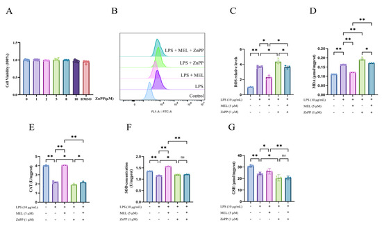 As shown in Figure 3A, treating BEECs with 1, 2, 5, 8, and 10 μM ZnPP had no effect on cell viability (p > 0.05). Pretreatment with ZnPP abolished the suppressive effect of meloxicam on LPS-induced ROS and MDA production (LPS + MEL vs. LPS + MEL + ZnPP) and resulted in higher contents of ROS and MDA relative to the LPS group (LPS vs. LPS + ZnPP) (Figure 3B–D).