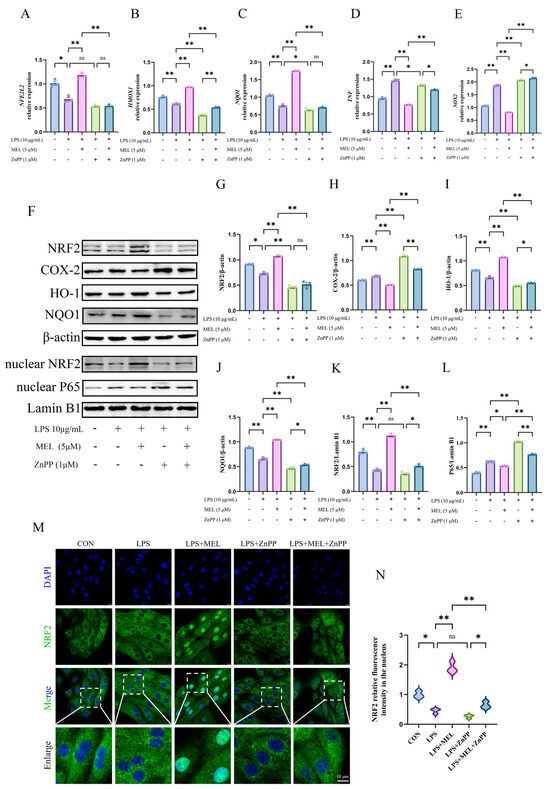 The immunofluorescence results confirmed the reduced (p < 0.01) nuclear NRF2 signal intensity induced by ZnPP under the co-treatment conditions with LPS and meloxicam (Figure 4M,N). In addition, meloxicam caused a slight increase (p < 0.05) in nuclear NRF2 abundance in the presence of ZnPP (LPS + ZnPP vs. LPS + MEL + ZnPP). No change (p > 0.05) was found in the nuclear signal intensity between the LPS and the LPS + ZnPP groups.