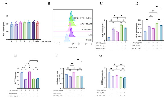 As illustrated in Figure 5A, ML385 at concentrations of 1, 2, 5, 8, and 10 μM had no significant impact on BEEC viability. When compared to the LPS group, the cells in the LPS + ML385 group exhibited higher levels of ROS and MDA (p < 0.05). Similarly, the cells in the LPS + MEL + ML385 group had higher ROS and MDA levels relative to the LPS + MEL group (p < 0.05). However, the inclusion of meloxicam decreased the ROS and MDA levels in comparison to the LPS + ML385 group (p < 0.05). Analogous to the previously mentioned findings, meloxicam supplementation upregulated the levels of antioxidant markers relative to the LPS group (p < 0.05, Figure 5E–G). This antioxidant effect of meloxicam was reversed (p < 0.01) by ML385 in LPS-stimulated BEECs. In comparison to the LPS group, supplementation with ML385 led to elevated concentrations of CAT and SOD, yet a decreased GSH concentration (all p < 0.05). There was no significant difference in the concentrations of CAT, SOD, and GSH between the LPS + ML385 and the LPS + MEL + ML385 groups.
