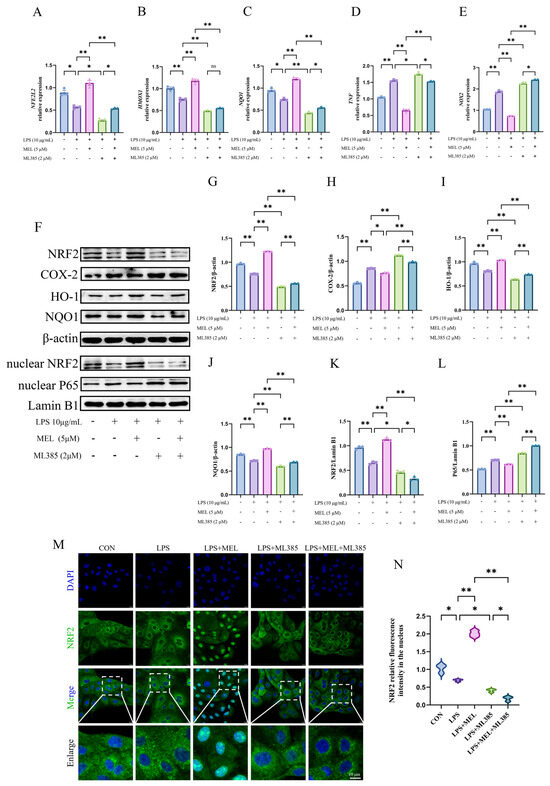 As shown in Figure 6A–L, pretreatment with ML385 reversed (p < 0.01) the meloxicam-induced expression (p < 0.01) of genes (NFE2L2, HMOX1, and NQO1) and proteins (NRF2, HO-1, and NQO1) in Nrf2 pathway, as well as the meloxicam-induced suppression (p < 0.01) of proinflammatory genes (TNF and NOX2) and proteins (COX-2 and nuclear P65) in BEECs with oxidative stress. In addition, ML385 further reduced (p < 0.05) the already inhibited expression of these antioxidant genes and proteins under LPS stimulation, while concurrently exacerbating (p < 0.05) the expression of the proinflammatory genes and proteins. In comparison to the co-treatment with LPS and ML385, there was generally a mild rise in the antioxidant gene and protein expression (except nuclear NRF2) and a decrease in proinflammatory gene and protein expression (except NOX2 and nuclear P65) in the cells of the LPS + MEL + ML385 group. According to the immunofluorescent result in Figure 6M,N, ML385 prevented (p < 0.05) the meloxicam-induced NRF2 translocation to the nucleus in LPS-stimulated BEECs. A further reduction (p < 0.05) in nuclear NRF2 protein was observed in response to meloxicam treatment in BEECs cotreated with LPS and ML385. The original images can be found in File S1.