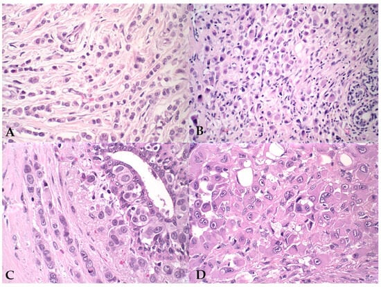 Both species exhibited histopathological characteristics indicative of poorly differentiated carcinomas, with abundant eosinophilic cytoplasm and varied cellular patterns, including plasmacytoid and signet-ring-like cells. The nuclei were markedly pleomorphic, with eccentric placement and prominent nucleoli. In certain regions, tumor cells were arranged in single-cell rows within the connective stroma, forming the characteristic “linear par” pattern (Figure 1).