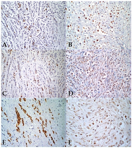 Photomicrographs illustrating features of pleomorphic lobular carcinoma in human (A,C,E) and canine (B,D,F) mammary glands, immunohistochemical (IHC) staining. (A,B) Nuclear staining with the proliferation marker Ki-67, IHC, 40× magnification; (C,D) nuclear staining of epithelial neoplastic cells for the progesterone receptor, IHC, 40× magnification; (E,F) nuclear staining of epithelial neoplastic cells for the estrogen receptor, IHC, 40× and 60× magnification, respectively.