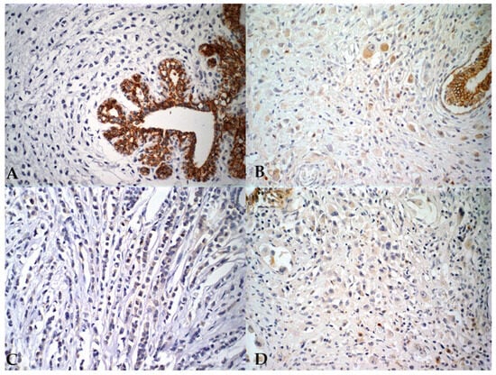 Regarding hormonal markers, all female dogs tested positive for PR (100%–26/26), with the majority exhibiting between 50% and 75% of positive cells. For ER, only one female dog showed positivity (3.8%–1/26), while 96.2% (25/26) showed less than 1% of positive cells, classifying them as negative (Figure 2).
