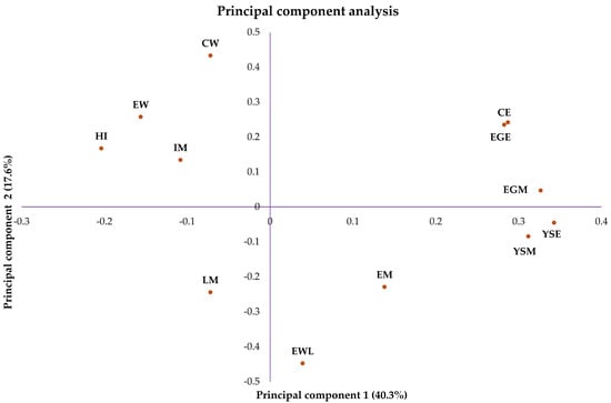Principal component analysis of the parameters measured during the experimental period. Hatchability of fertile eggs (HI); number of contaminated eggs (CE); early mortality (EM); intermediate mortality (IM); late mortality (LM); egg weight (EW); egg weight loss (EWL); chick weight (CW); yolk sac mesophiles (YSM); yolk sac Enterobacteriaceae (YSE); eggshell mesophiles (EGM); eggshell Enterobacteriaceae (EGE).