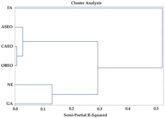 In addition to the partial R2, which indicated the individual contribution of each variable to the separation of clusters, the values of p < F, p < Lambda, and p < ASCC were also analyzed (Table 2). The p < F showed the differences in means between groups, while p < Lambda and p < ASCC confirmed the multivariate separation of the clusters. All tests showed p < 0.05, indicating that the variables significantly discriminate the groups both individually and in combination.