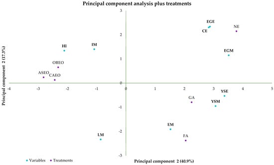 Principal component analysis of the parameters measured during the experimental period plus treatments. Hatchability of fertile eggs (HI); number of contaminated eggs (CE); early mortality (EM); intermediate mortality (IM); late mortality (LM); yolk sac mesophiles (YSM); yolk sac Enterobacteriaceae (YSE); eggshell mesophiles (EGM); eggshell Enterobacteriaceae (EGE); non-sanitized eggs (NE); grain alcohol (GA); formaldehyde (FA); Citrus aurantifolia essential oil (CAEO); Ocimum basilicum essential oil (OBEO); Allium sativum essential oil (ASEO).