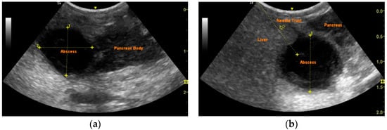 - Anderson, J.R.; Cornell, K.K.; Parnell, N.K.; Salisbury, S.K. Pancreatic Abscess in 36 Dogs: A Retrospective Analysis of Prognostic Indicators. J. Am. Anim. Hosp. Assoc. 2008, 44, 171–179. [Google Scholar] [CrossRef]