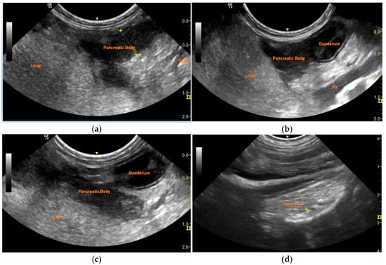 - Hecht, S.; Henry, G. Sonographic Evaluation of the Normal and Abnormal Pancreas. Clin. Tech. Small Anim. Pract. 2007, 22, 115–121. [Google Scholar] [CrossRef] [PubMed]