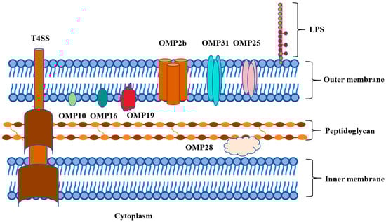 Outer membrane protein is the main component of the cell wall of Brucella, which has strong immunogenicity and protection, and is related to the virulence of the bacteria []. The outer membrane proteins of Brucella can be divided into three groups according to their molecular weights. The first group of outer membrane proteins, consisting of 10 KDa (Omp10), 18 KDa (Omp16), and 19 KDa (Omp19), are lipoproteins that are closely related to Brucella virulence. The second group of outer membrane proteins, including Omp22, Omp25, Omp25A, Omp25B, Omp25C, Omp25D, and Omp31, weighing 25–27 KDa and 31–34 KDa, respectively, play important roles in maintaining the integrity of the cell envelope (Figure 1). These Omps are pore proteins that conjunct with the LPS O-chain to protect Brucella from complement and other antimicrobial peptides encountered in the host. The third group of Omps, comprising Omp2a and Omp2b, possess a molecular weight ranging from 36 to 38 KDa and are homologous outer membrane proteins that exhibit properties characteristic of bacterial porins [,]. Omps are important virulence factors of Brucella. Furthermore, they act as pathogen-associated molecular patterns (PAMPs) to activate receptors activating the immune response.