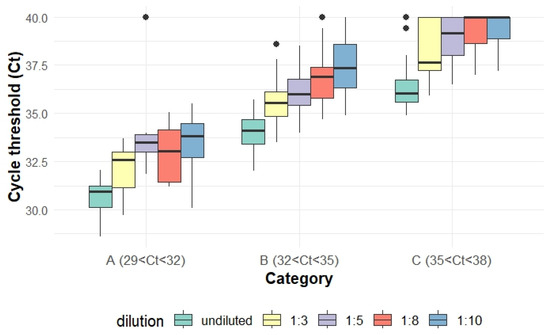 Box plot depicting Ct value variations across different dilution levels within each Ct value category.