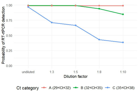 Changes of probability of PRRSV RNA detection after different levels of dilution for each Ct value category.